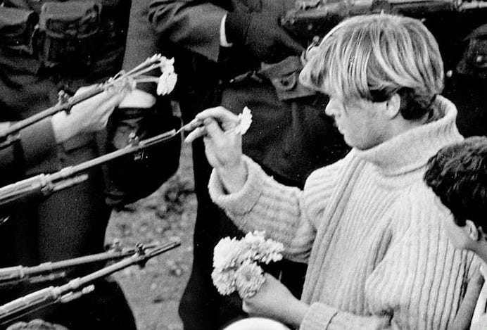 [ Photo Credit: Bernie Benton - October 21, 1967. Vietnam War Protester George Harris putting a wildflower into the barrel of a rifle held by a soldier]